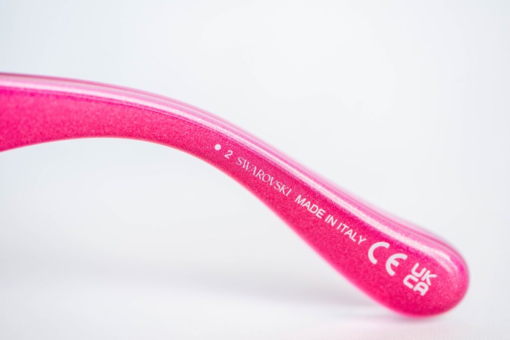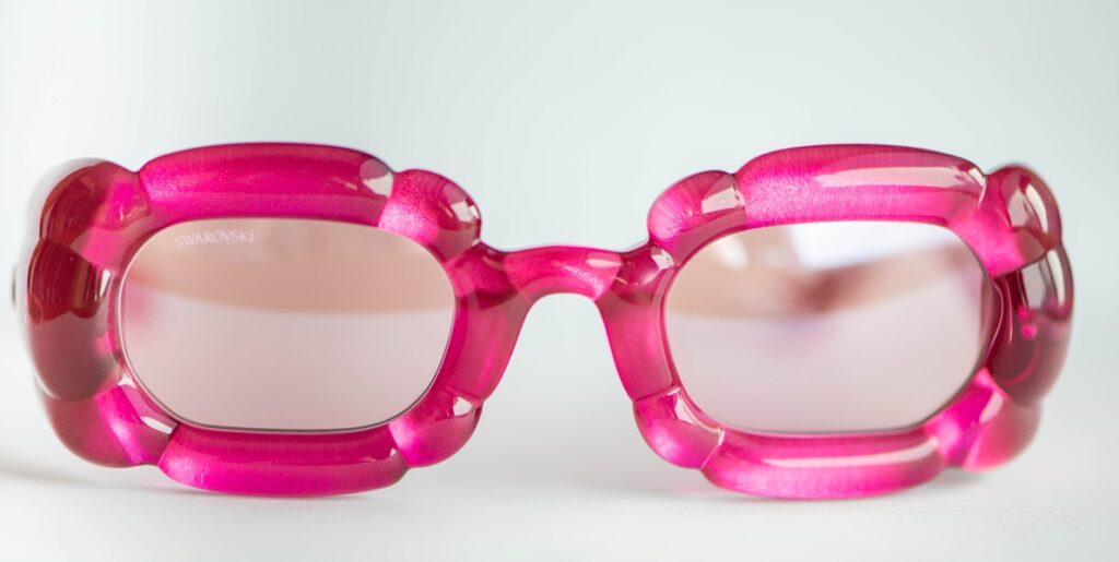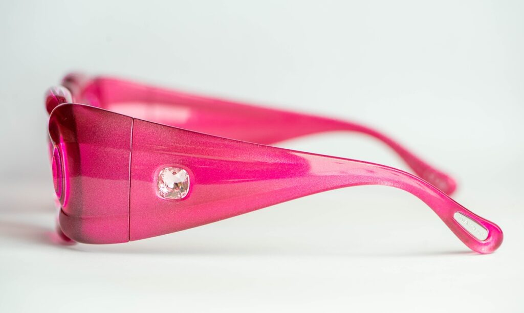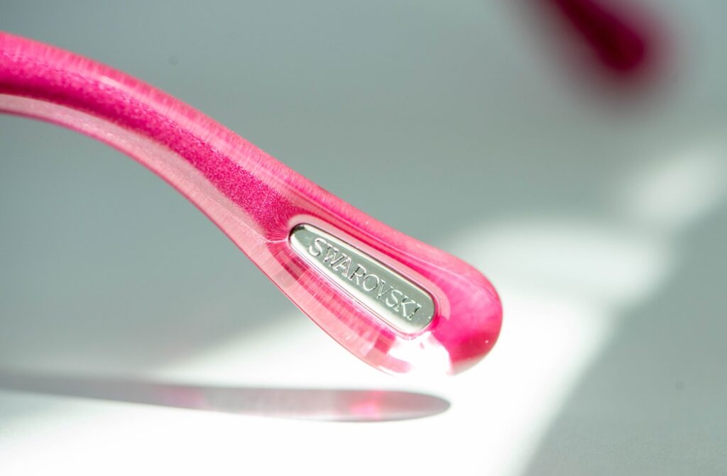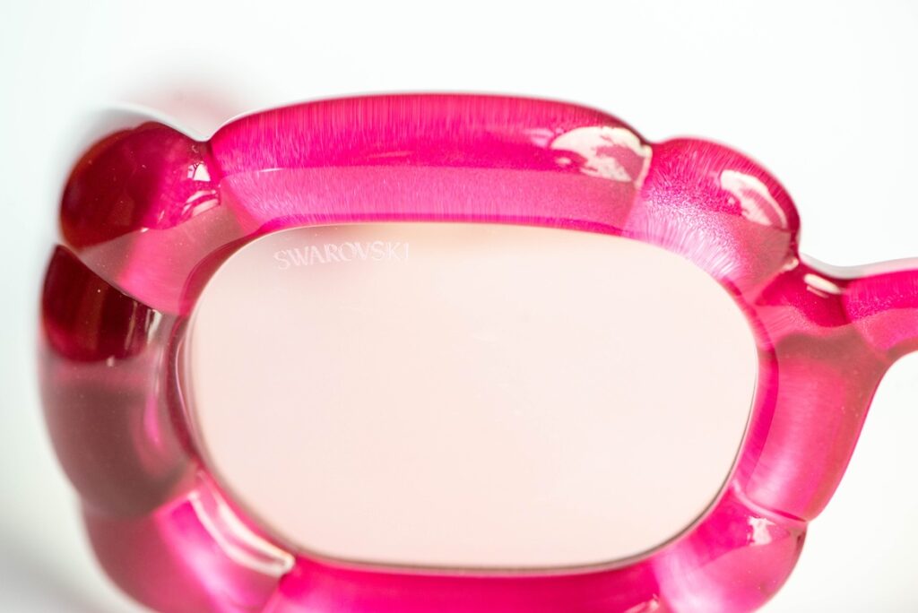 Swarovski SK335 pink sunglasses with a sculptural “bubble” frame design and two light pink crystals, one on each temple. A playful, jewelry-like design. A bold, playful piece blending eyewear and jewelry aesthetics.