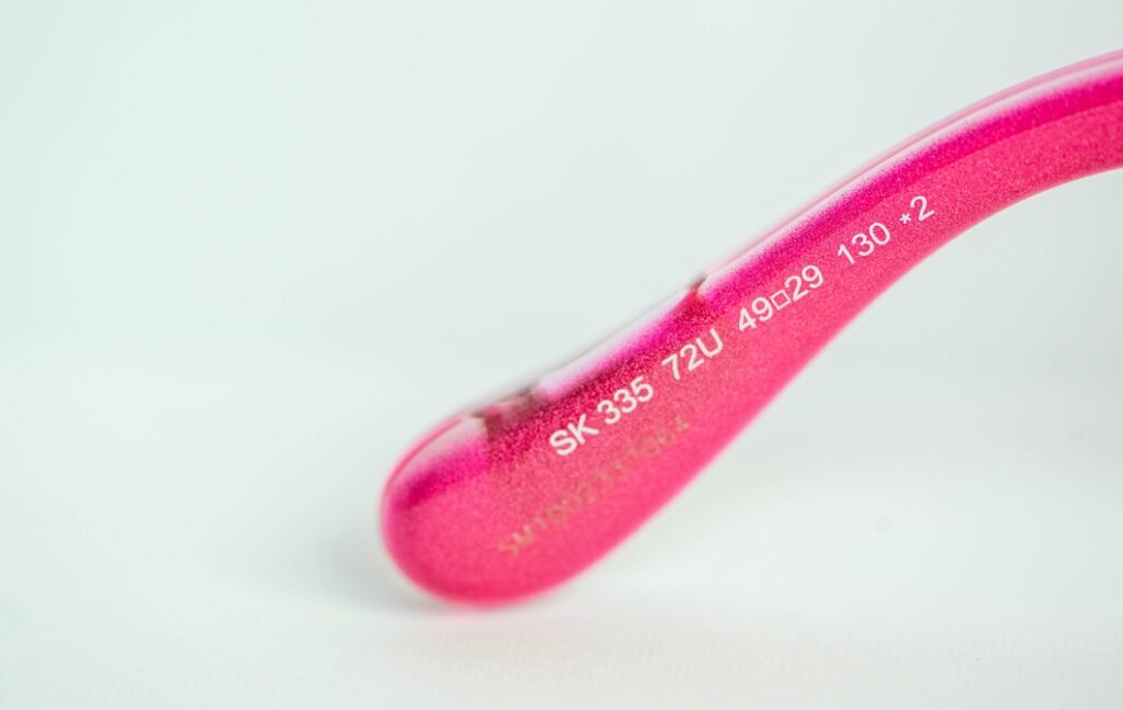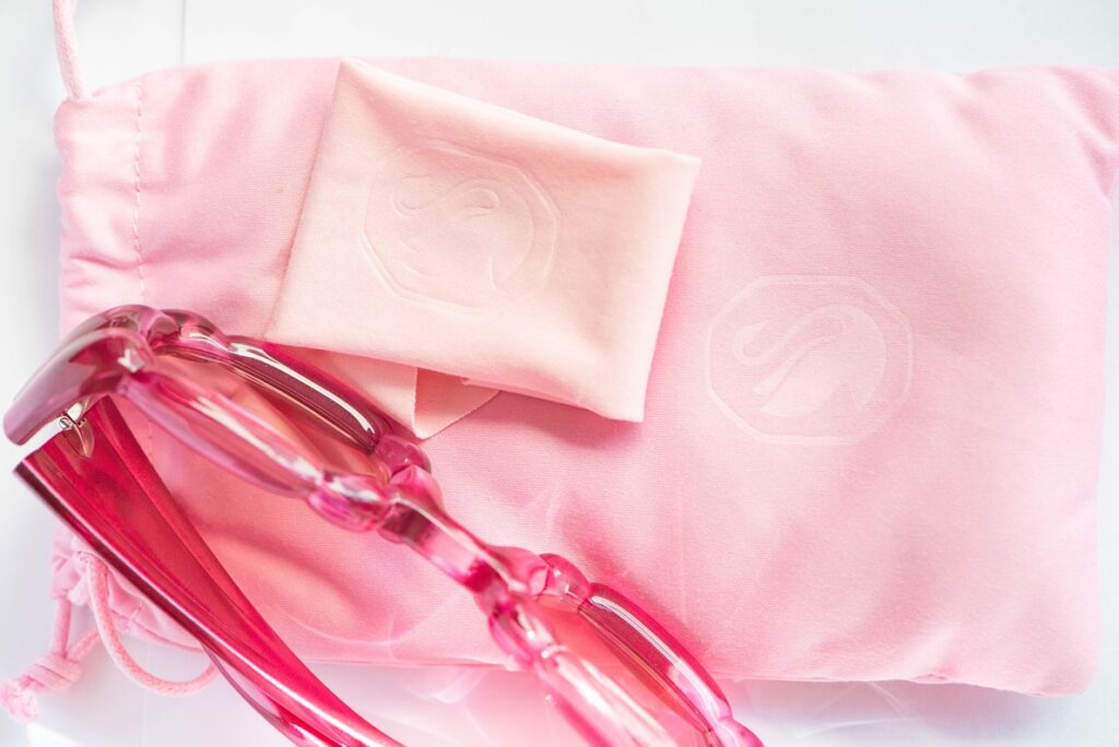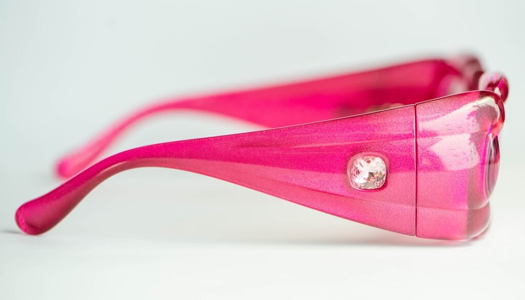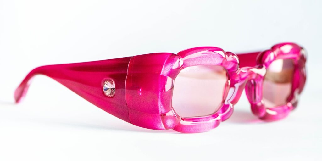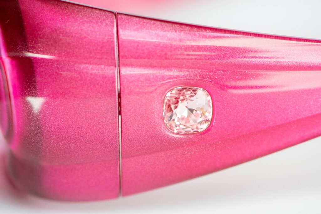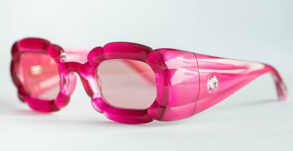 Swarovski SK335 pink sunglasses with a sculptural “bubble” frame design and two light pink crystals, one on each temple. A playful, jewelry-like design. A bold, playful piece blending eyewear and jewelry aesthetics.